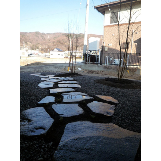 HAL設計室の設計監理 諏訪市の住宅。 敷地を掘ると鉄平石がザクザクと産出。 さすがは鉄平石のご当地、諏訪。 石の足触りが心地良い大判の鉄平石のアプローチ。 大きなカツラの木が景色を作ってくれます。