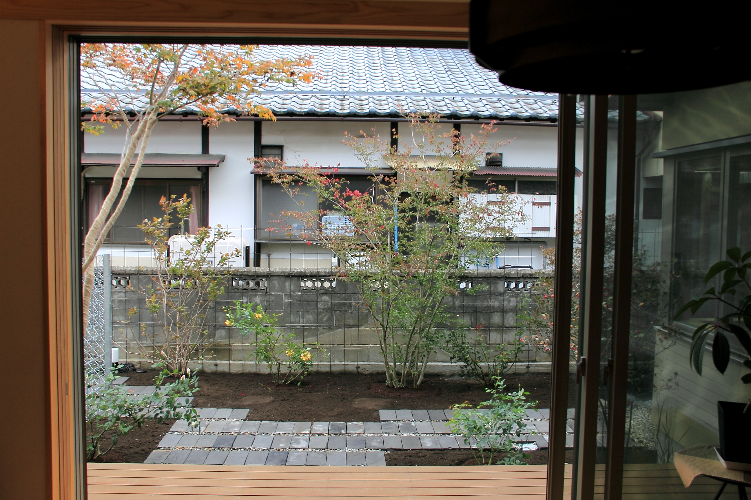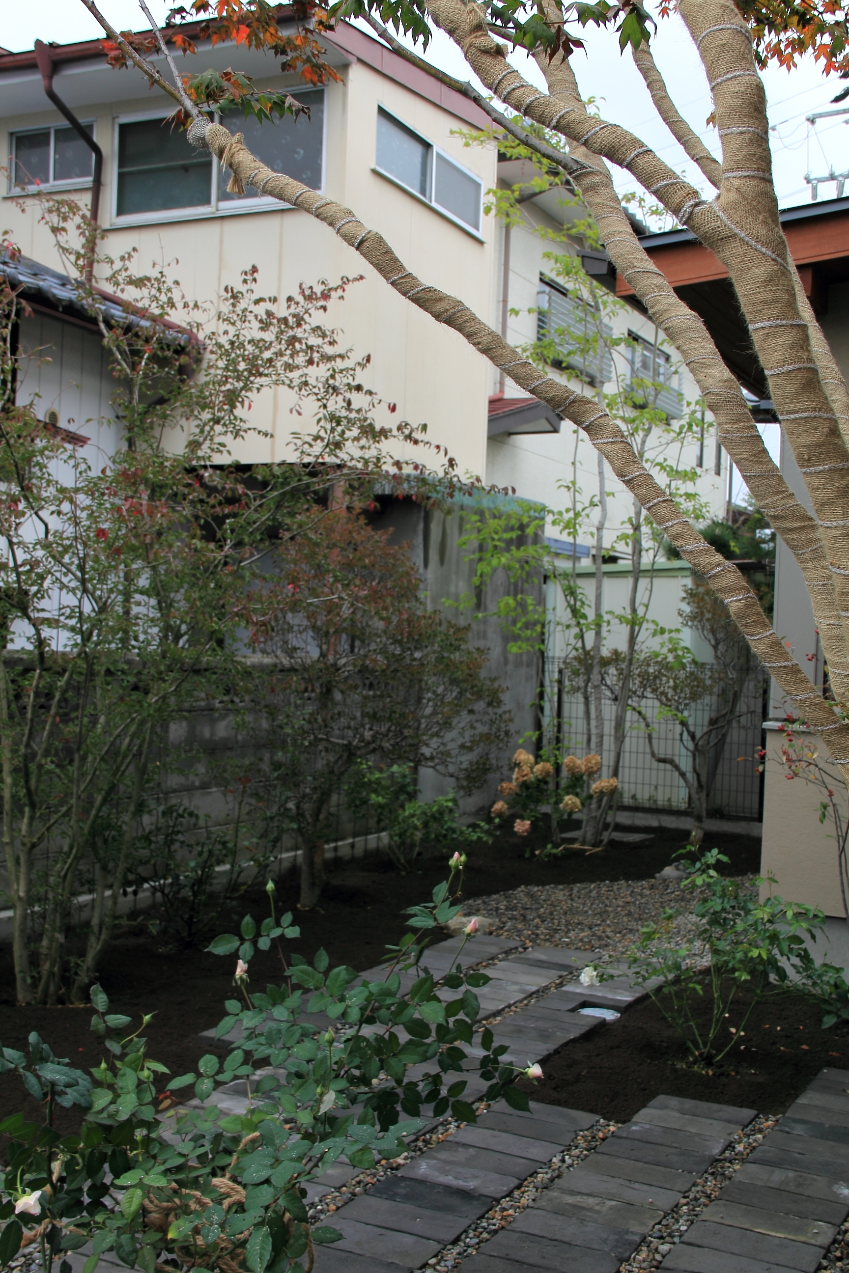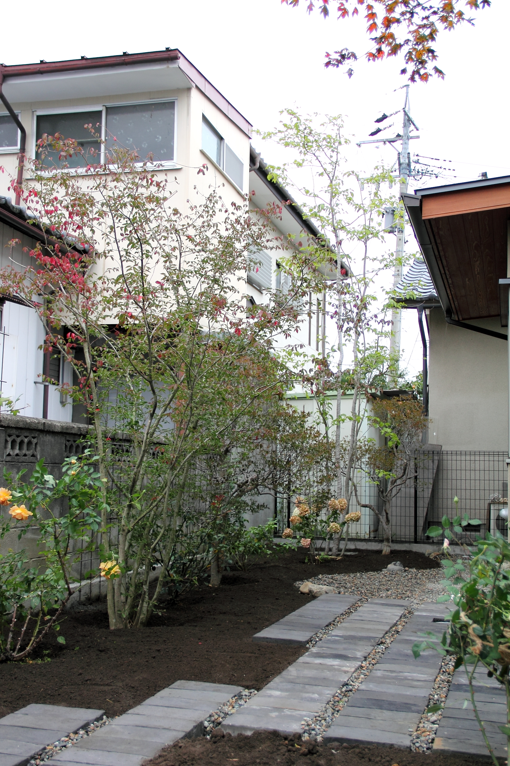 笹部の家 藤松建築設計室(https://www.f-a.jp/)設計・管理の松本市の住宅の2期造園工事。 レンガ敷きのテラスは園路の役割も担います。 丹精込めて育ててこられたバラとこれから楽しんで植えていただく草花が楽しみです。
